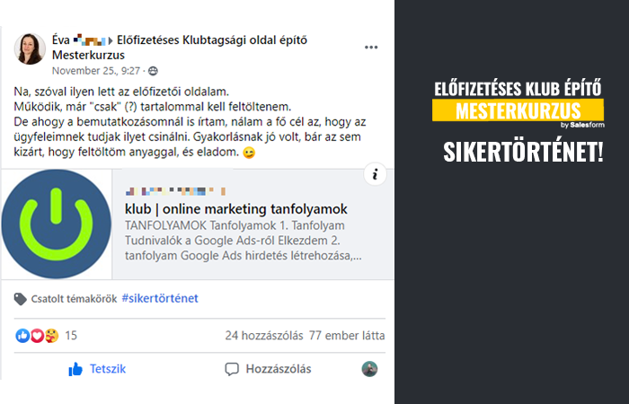 Erős picit? Nem hinném. Képzeld, több tucat ehhez hasonló üzenetet kapok minden hónapban, azoktól, akik elindultak az EKM (Előfizetéses Klubépítő Mesterkurzus) képzésemben és csatlakoztak a PRO tagsághoz, ami maga a közösség és az egy éves támogatás. Most pedig szeretnélek TÉGED is elindítani ezen az úton. Ugye milyen klassz lenne, ha tudnál nekem ilyet írni?